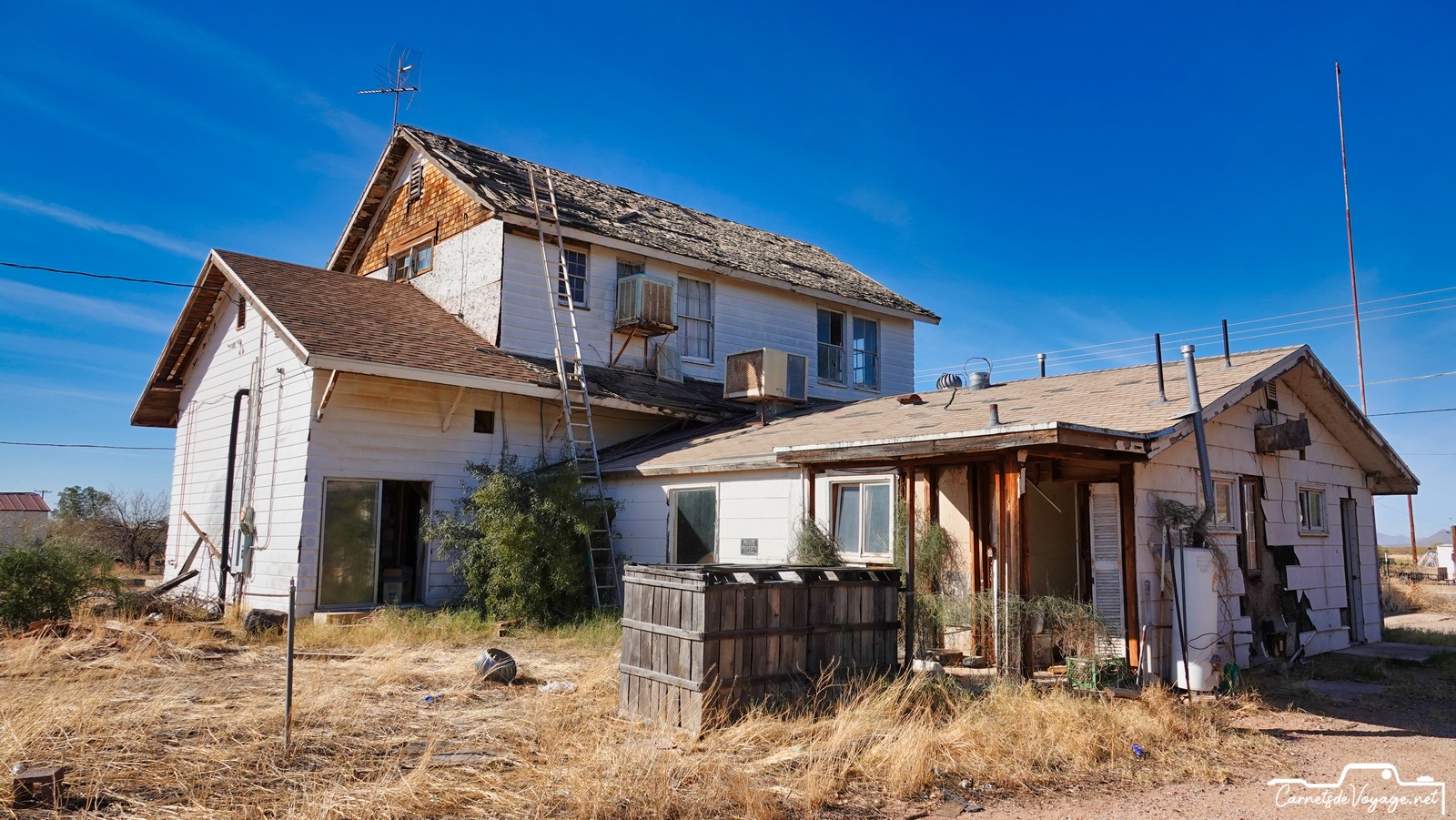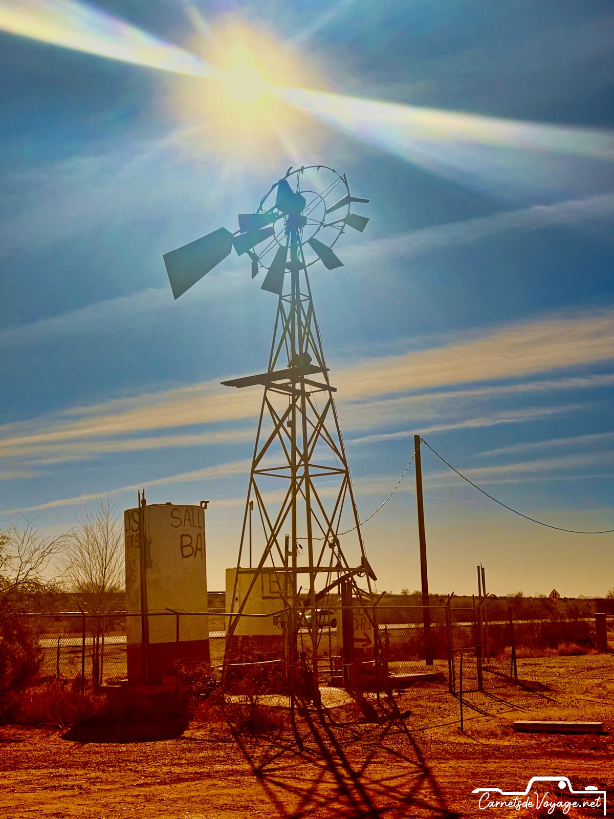 En route, on s’est arrêtés à mi-chemin entre Tucson et Phoenix, quelques minutes d’arrêt un peu avant le Picacho Peek pour voir un très ancien réservoir d’eau pour les trains à vapeur près de la Pacific Railroad qui passe par Tucson et rejoint Phoenix, Los Angeles et San Francisco.