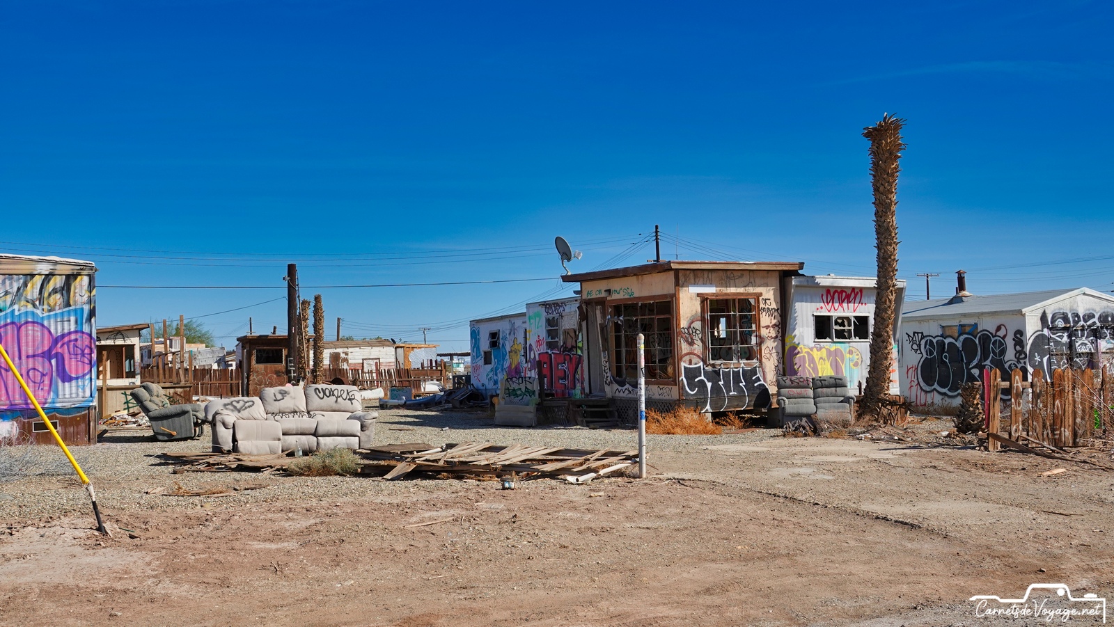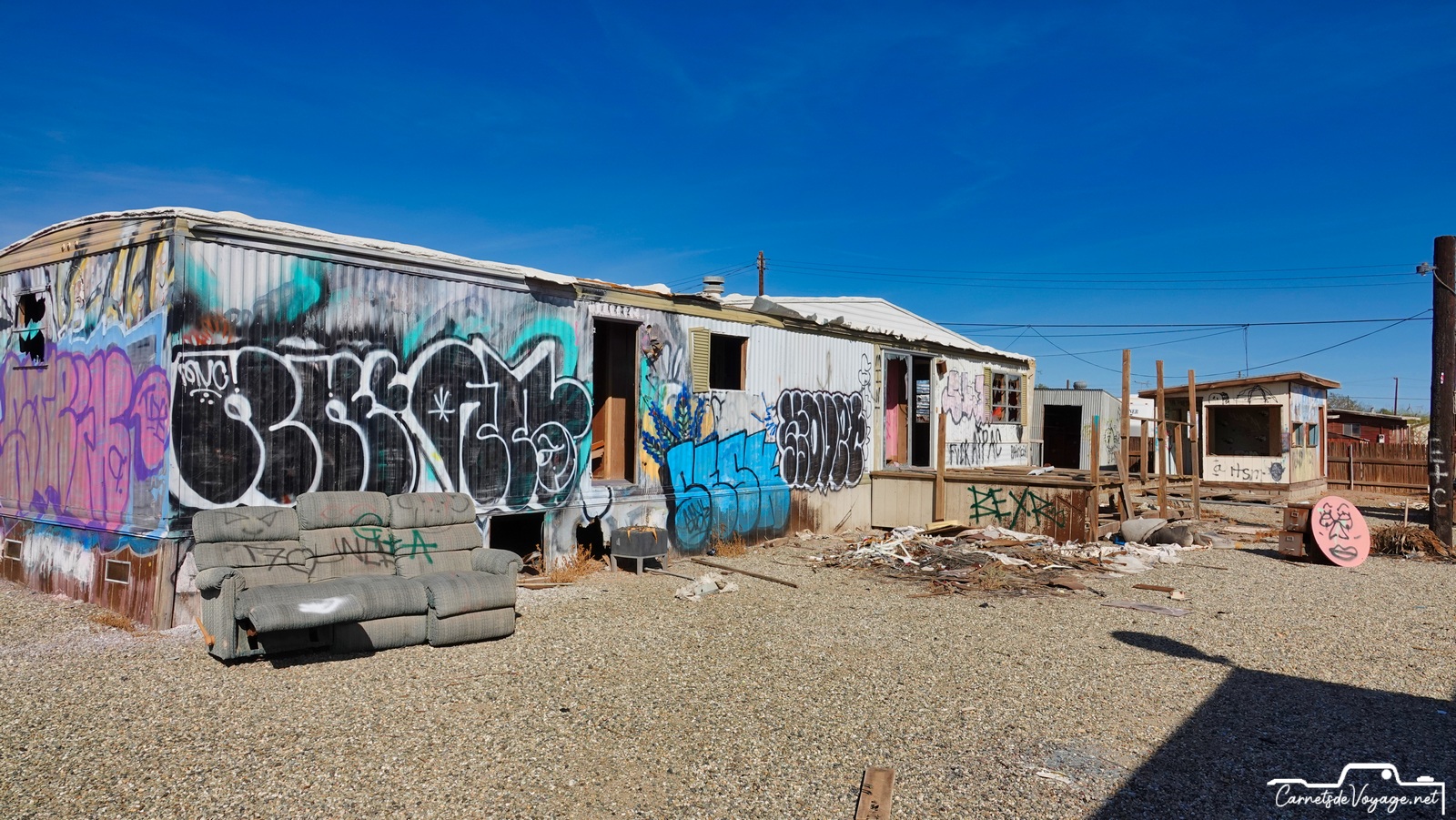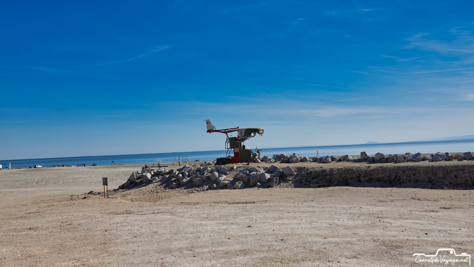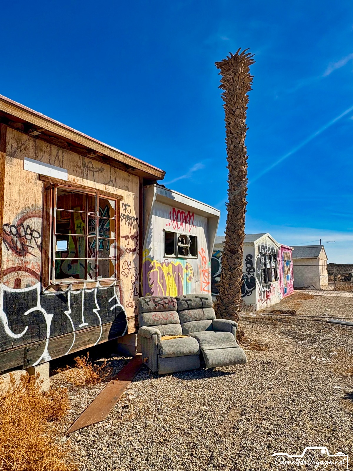 Cette mer, créée par une catastrophique crue du Colorado en 1905, qui a noyé 1000 km2 de désert, a été utilisée pendant quelques décennies comme station balnéaire, lieu très prisé des habitants de Californie et de l’Arizona. Malheureusement, cette mer très salée n’est alimentée que par les eaux de ruissellement de la vallée impériale, immense zone agricole située au sud. Et ces eaux sont gorgées de pesticides et d’engrais en tout genre… Depuis le début des années 80, cette région est devenue si polluée que tous les poissons sont morts et que les hommes ont quitté ce lieu devenu si sale que c’est une des zones les plus cancérogènes des USA ! Signe de l’insalubrité du coin, pas un oiseau dans l’eau ou à l’horizon. La Salton Sea est morte, et ses rives autrefois si prisées pour la villégiature sont tristes et sinistres ! Quelques marginaux y vivent toujours très pauvrement. Des travaux qui doivent s’étendre sur 80 ans visent à lui redonner vie, en dépolluant l’eau et surtout en lui permettant de d’écouler vers le Pacifique. Aujourd’hui, tout ce qui s’y dépose y reste !