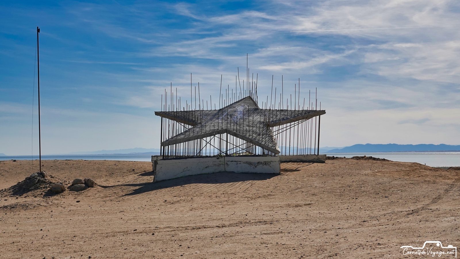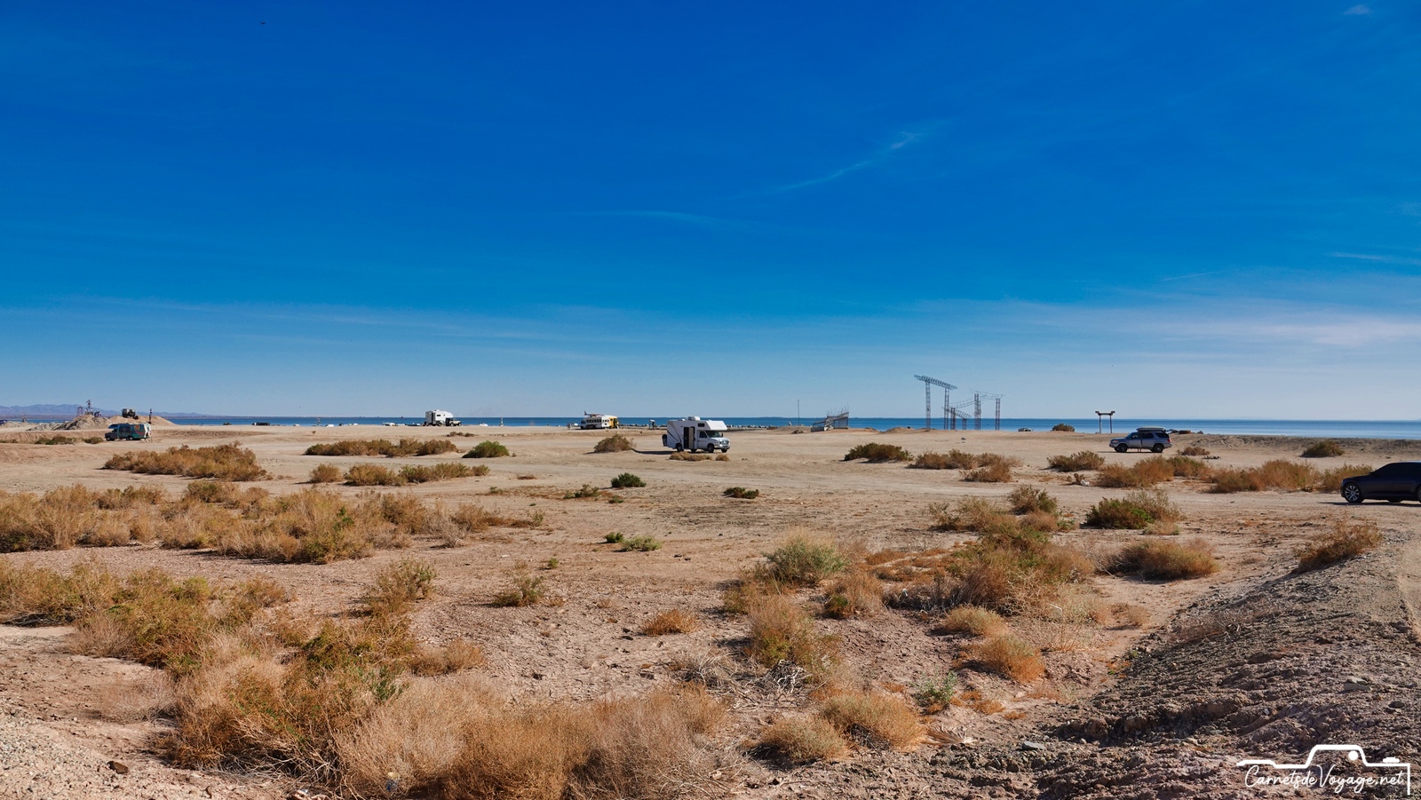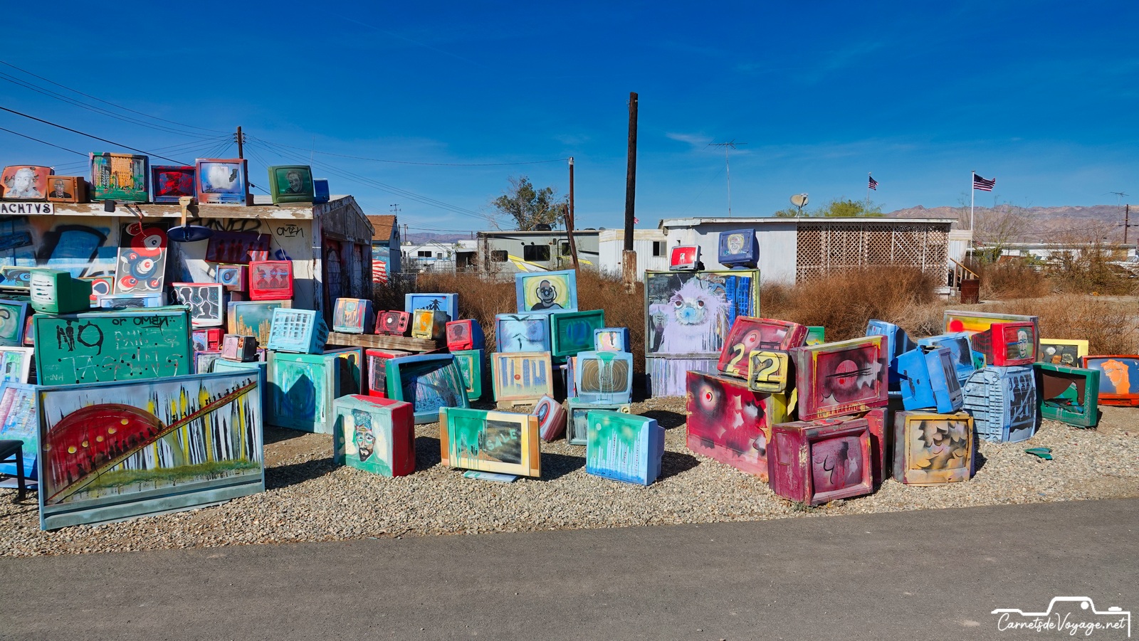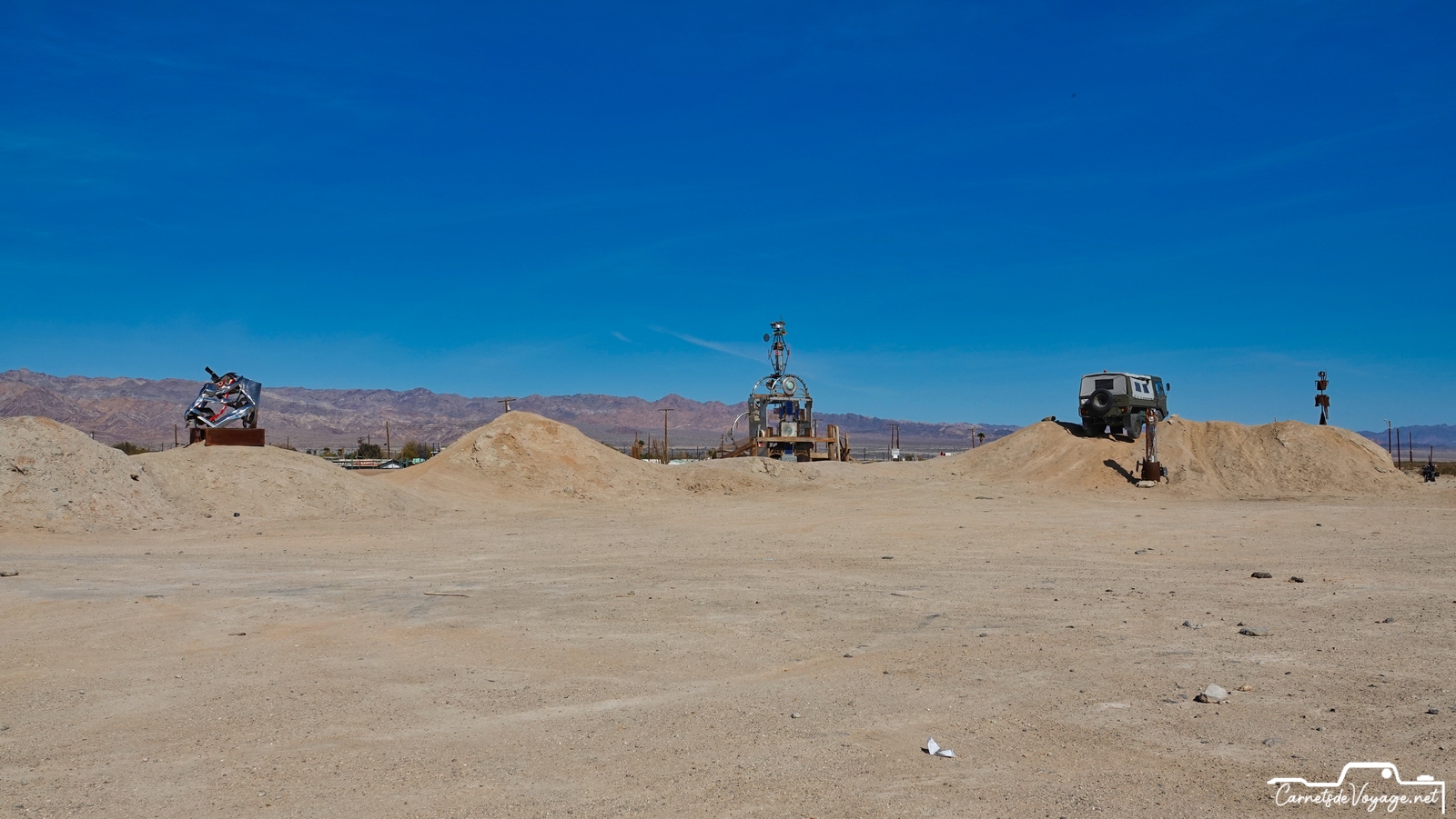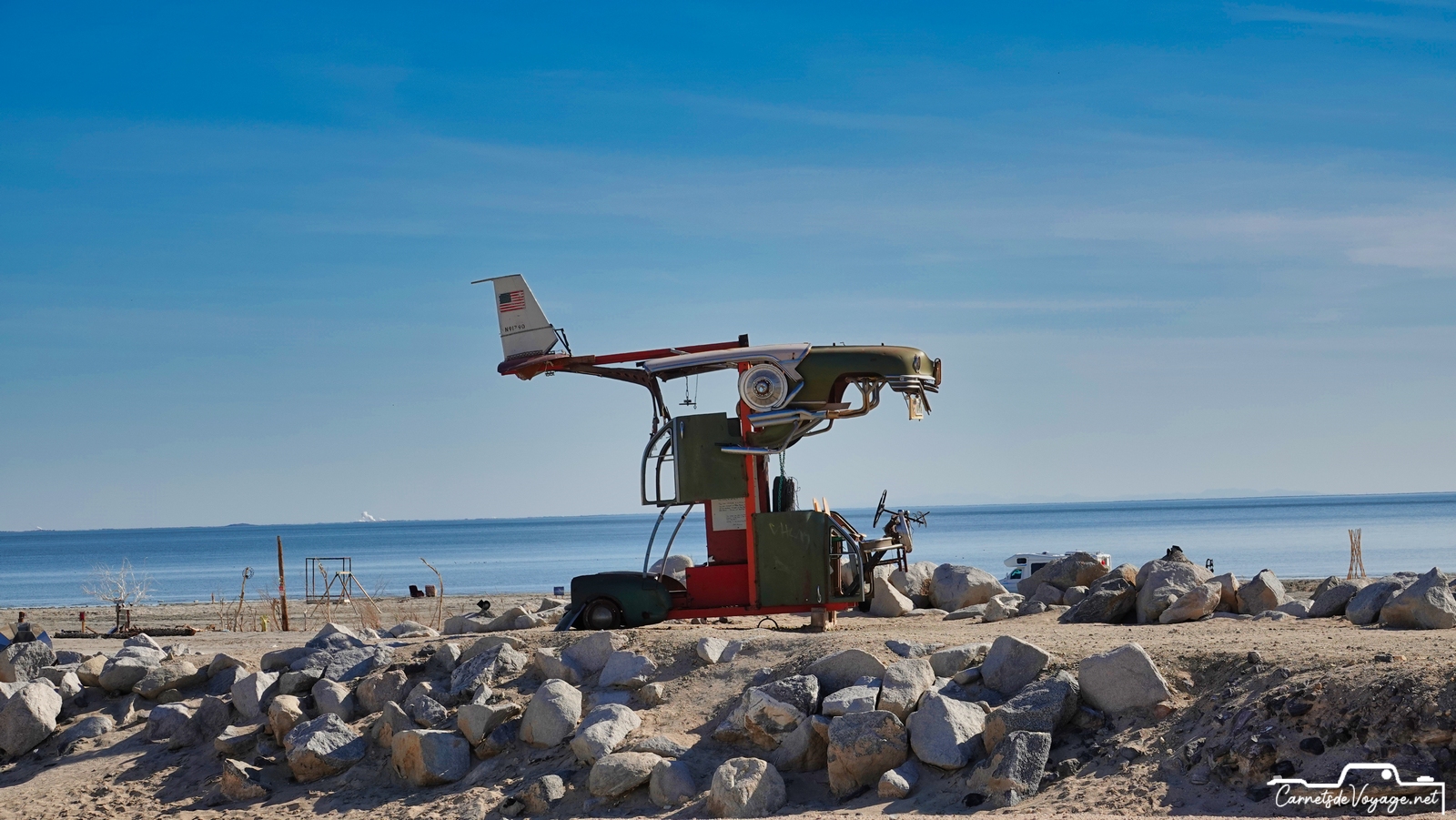 Cette mer, créée par une catastrophique crue du Colorado en 1905, qui a noyé 1000 km2 de désert, a été utilisée pendant quelques décennies comme station balnéaire, lieu très prisé des habitants de Californie et de l’Arizona. Malheureusement, cette mer très salée n’est alimentée que par les eaux de ruissellement de la vallée impériale, immense zone agricole située au sud. Et ces eaux sont gorgées de pesticides et d’engrais en tout genre… Depuis le début des années 80, cette région est devenue si polluée que tous les poissons sont morts et que les hommes ont quitté ce lieu devenu si sale que c’est une des zones les plus cancérogènes des USA ! Signe de l’insalubrité du coin, pas un oiseau dans l’eau ou à l’horizon. La Salton Sea est morte, et ses rives autrefois si prisées pour la villégiature sont tristes et sinistres ! Quelques marginaux y vivent toujours très pauvrement. Des travaux qui doivent s’étendre sur 80 ans visent à lui redonner vie, en dépolluant l’eau et surtout en lui permettant de d’écouler vers le Pacifique. Aujourd’hui, tout ce qui s’y dépose y reste !