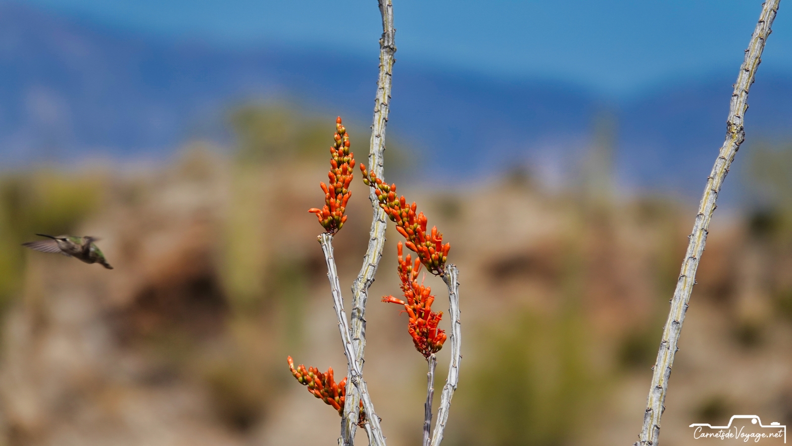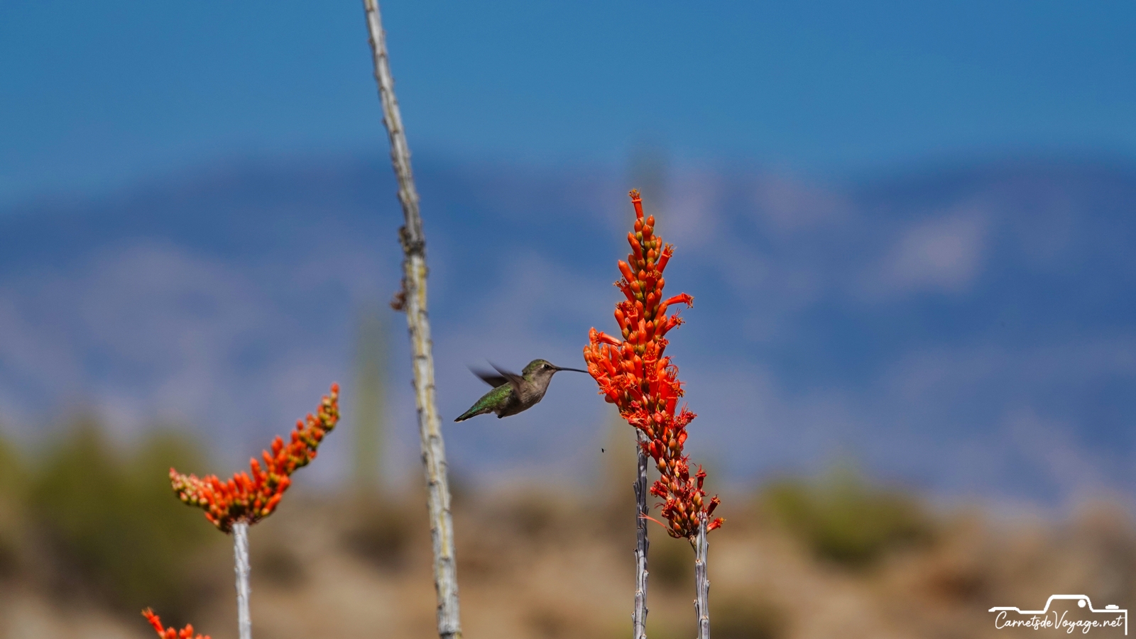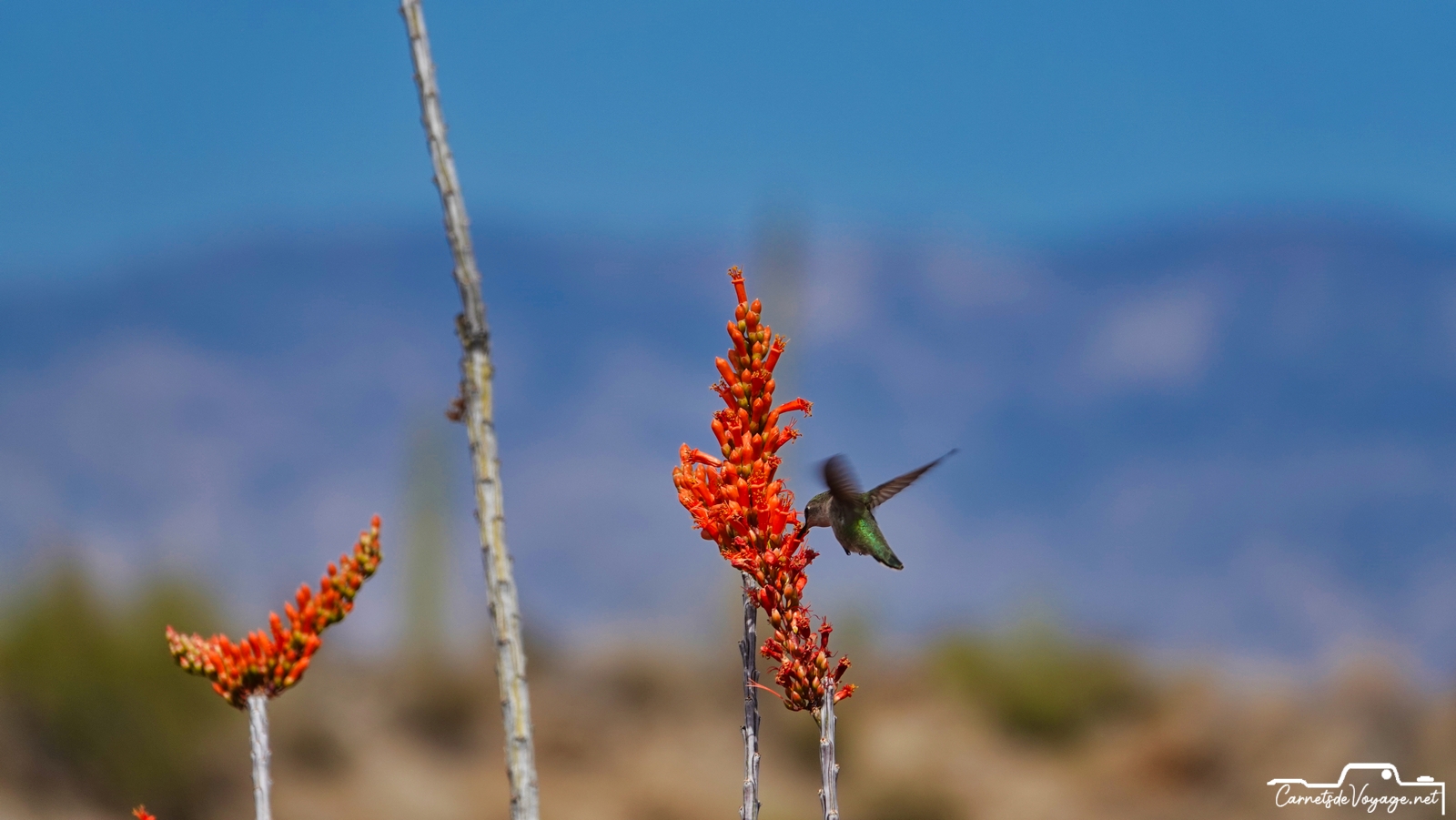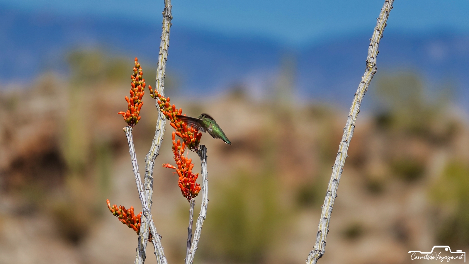 Un joli colibri est venu butiner les rares fleurs des ocotillos, ces longues plantes très piquantes, qui ont l’air d’un tas de branches mortes, sauf pendant la saison des pluies, l’été, où elles se parent de vert. en ce moment, c’est leur période de floraison. toujours impressionnant de voir ces minuscules oiseaux voler si vite et changer de sens si rapidement !