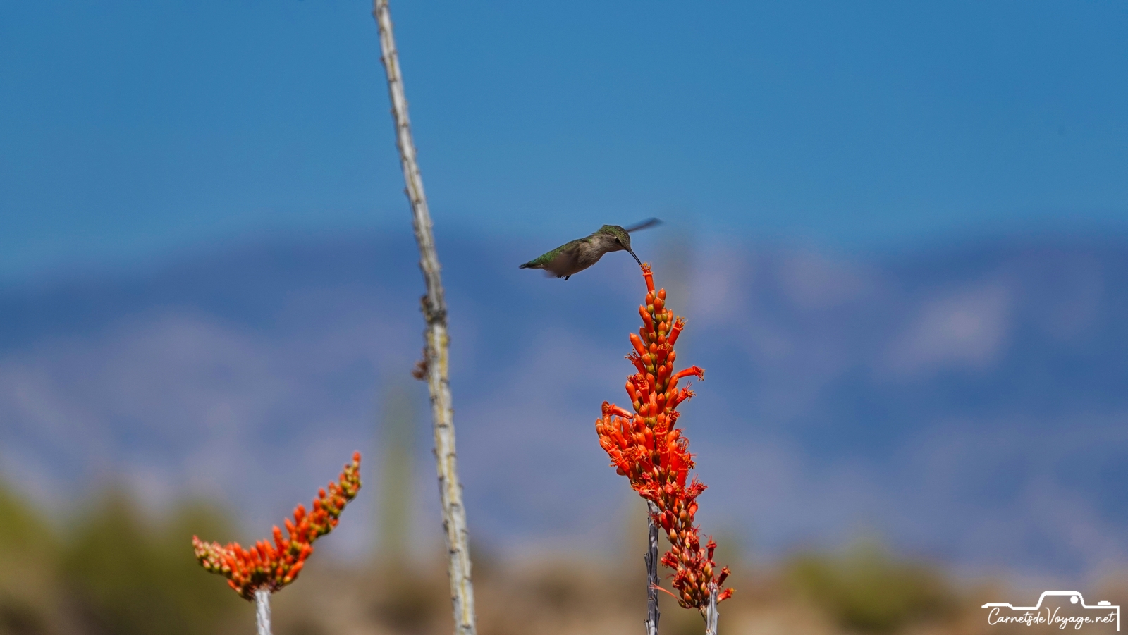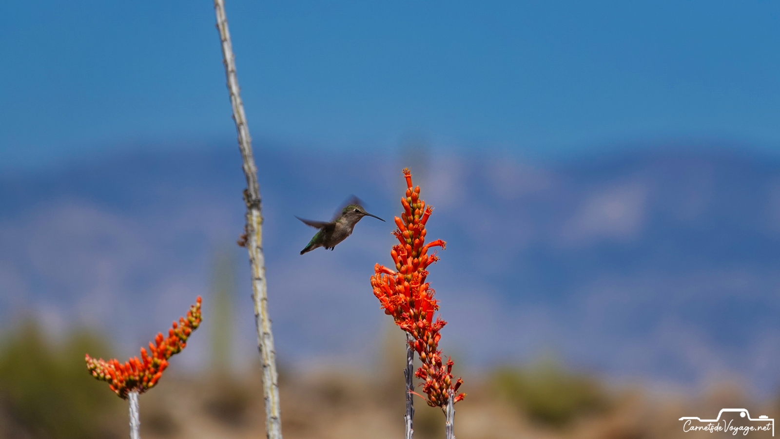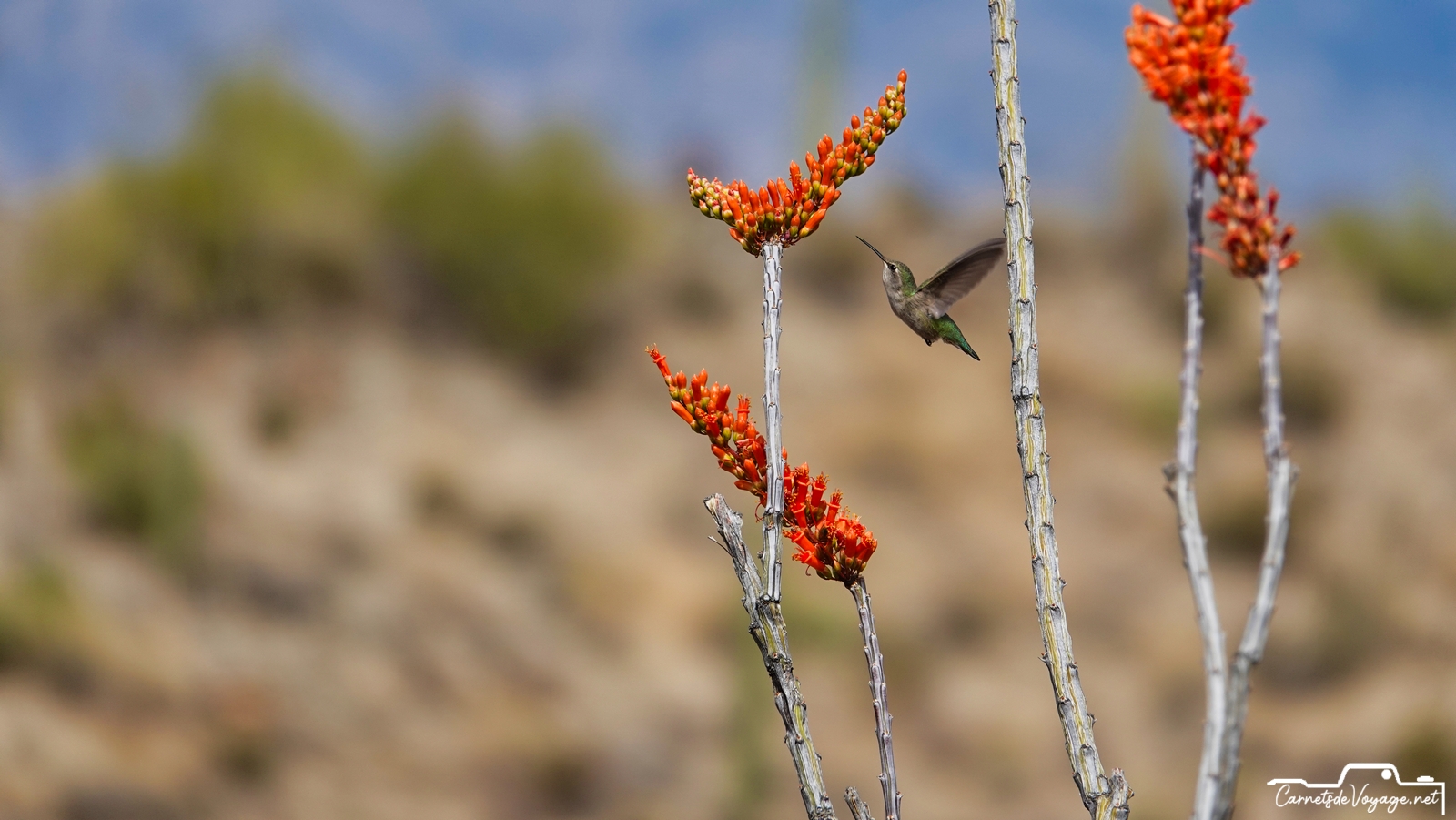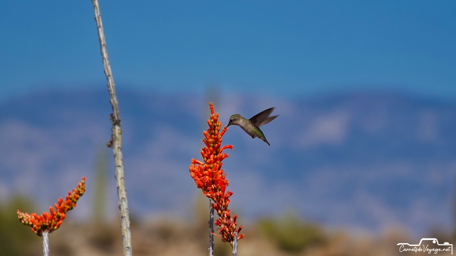 Un joli colibri est venu butiner les rares fleurs des ocotillos, ces longues plantes très piquantes, qui ont l’air d’un tas de branches mortes, sauf pendant la saison des pluies, l’été, où elles se parent de vert. en ce moment, c’est leur période de floraison. toujours impressionnant de voir ces minuscules oiseaux voler si vite et changer de sens si rapidement !