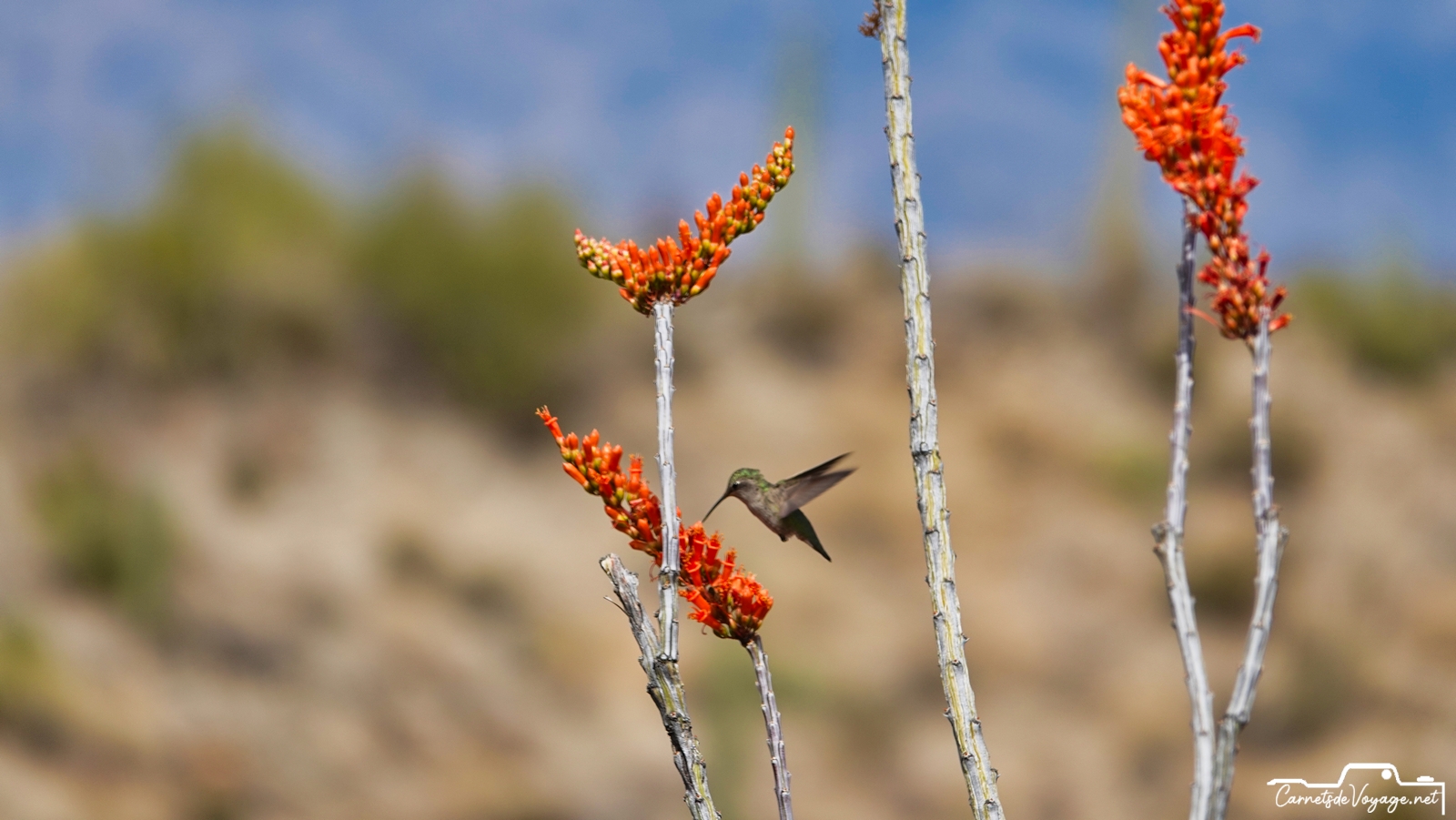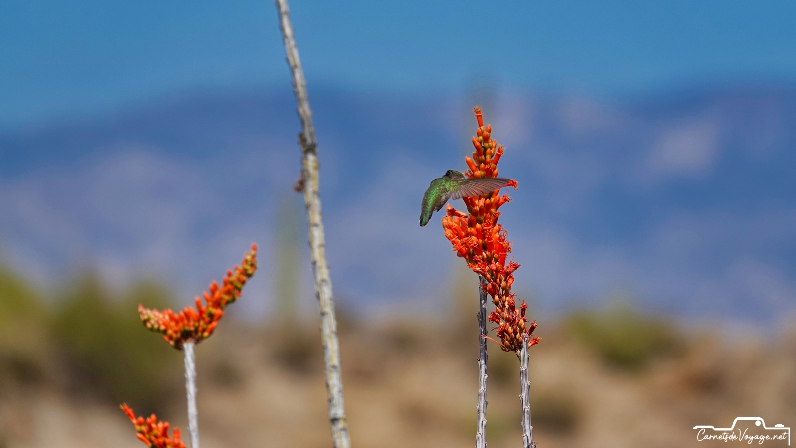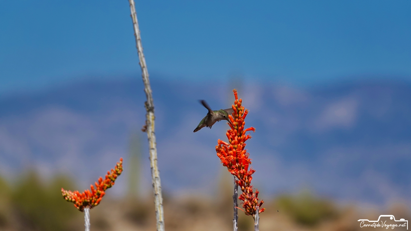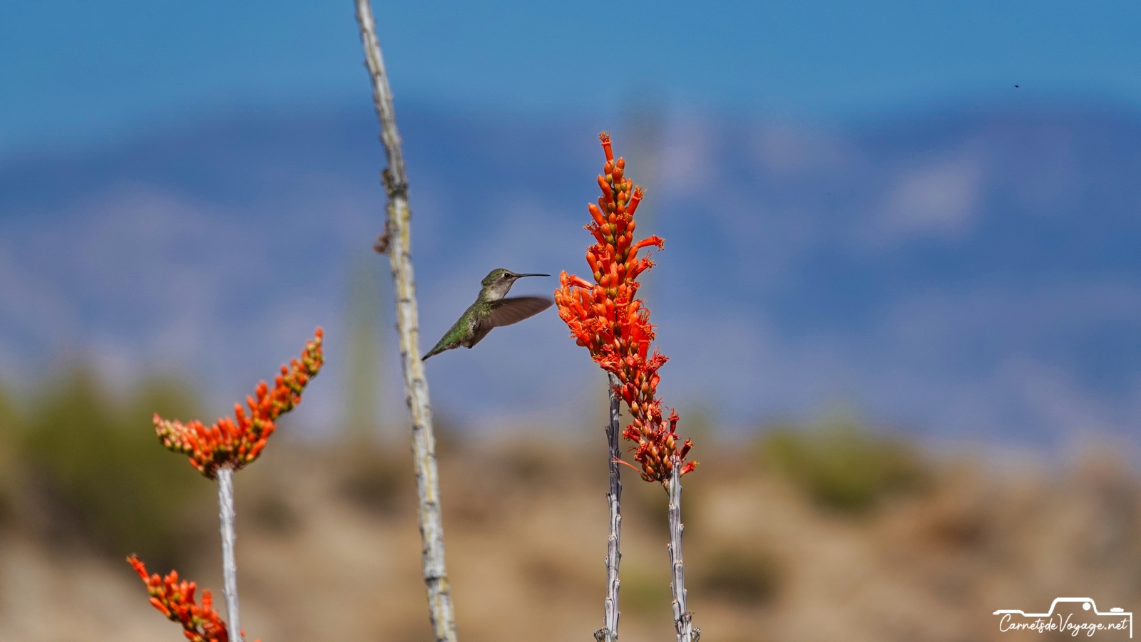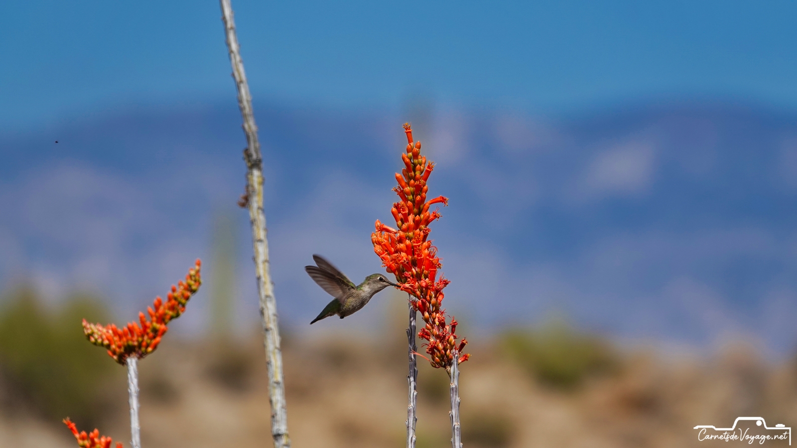 Un joli colibri est venu butiner les rares fleurs des ocotillos, ces longues plantes très piquantes, qui ont l’air d’un tas de branches mortes, sauf pendant la saison des pluies, l’été, où elles se parent de vert. en ce moment, c’est leur période de floraison. toujours impressionnant de voir ces minuscules oiseaux voler si vite et changer de sens si rapidement !