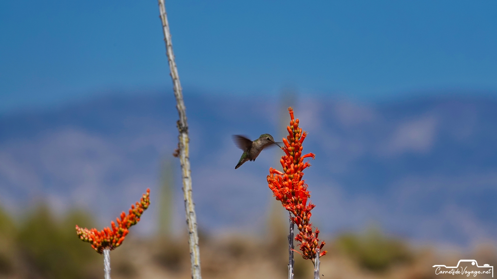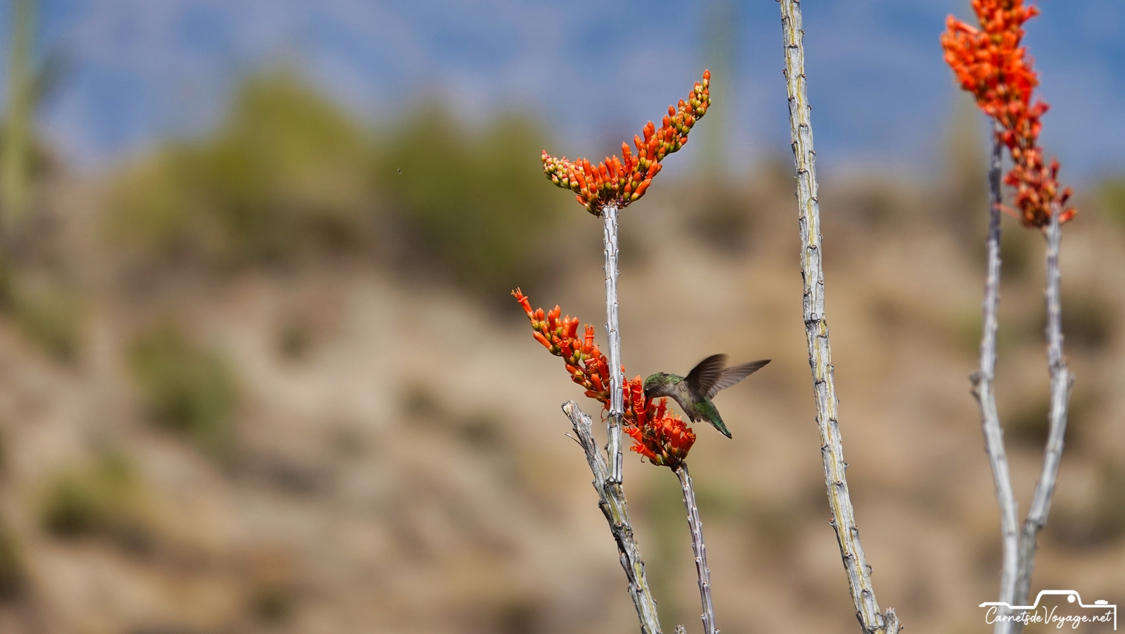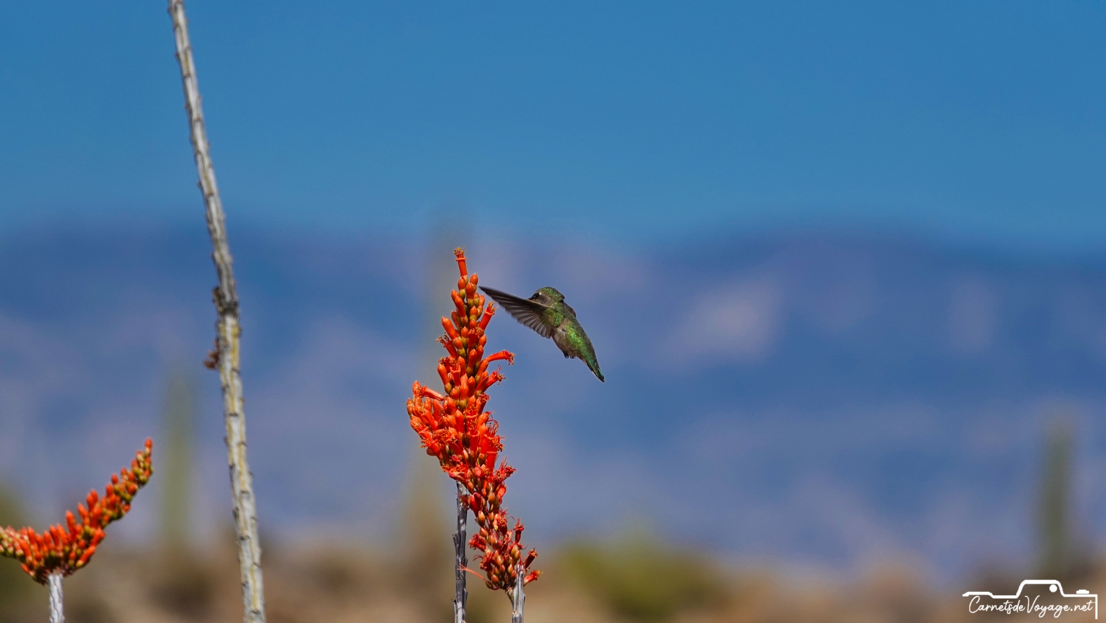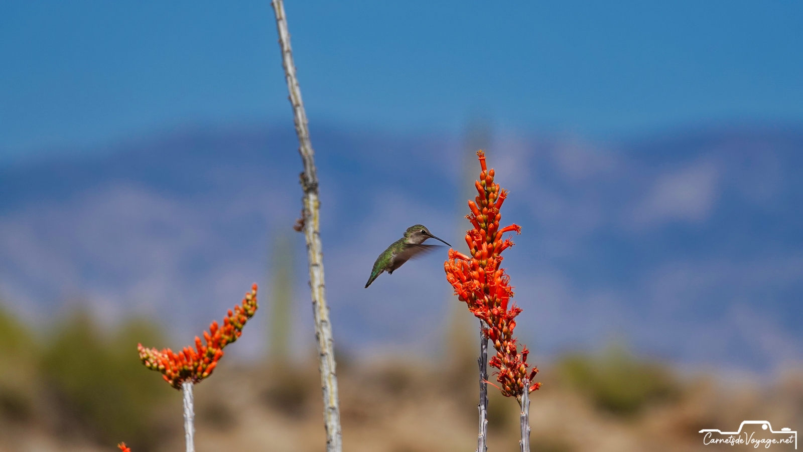 Un joli colibri est venu butiner les rares fleurs des ocotillos, ces longues plantes très piquantes, qui ont l’air d’un tas de branches mortes, sauf pendant la saison des pluies, l’été, où elles se parent de vert. en ce moment, c’est leur période de floraison. toujours impressionnant de voir ces minuscules oiseaux voler si vite et changer de sens si rapidement !
