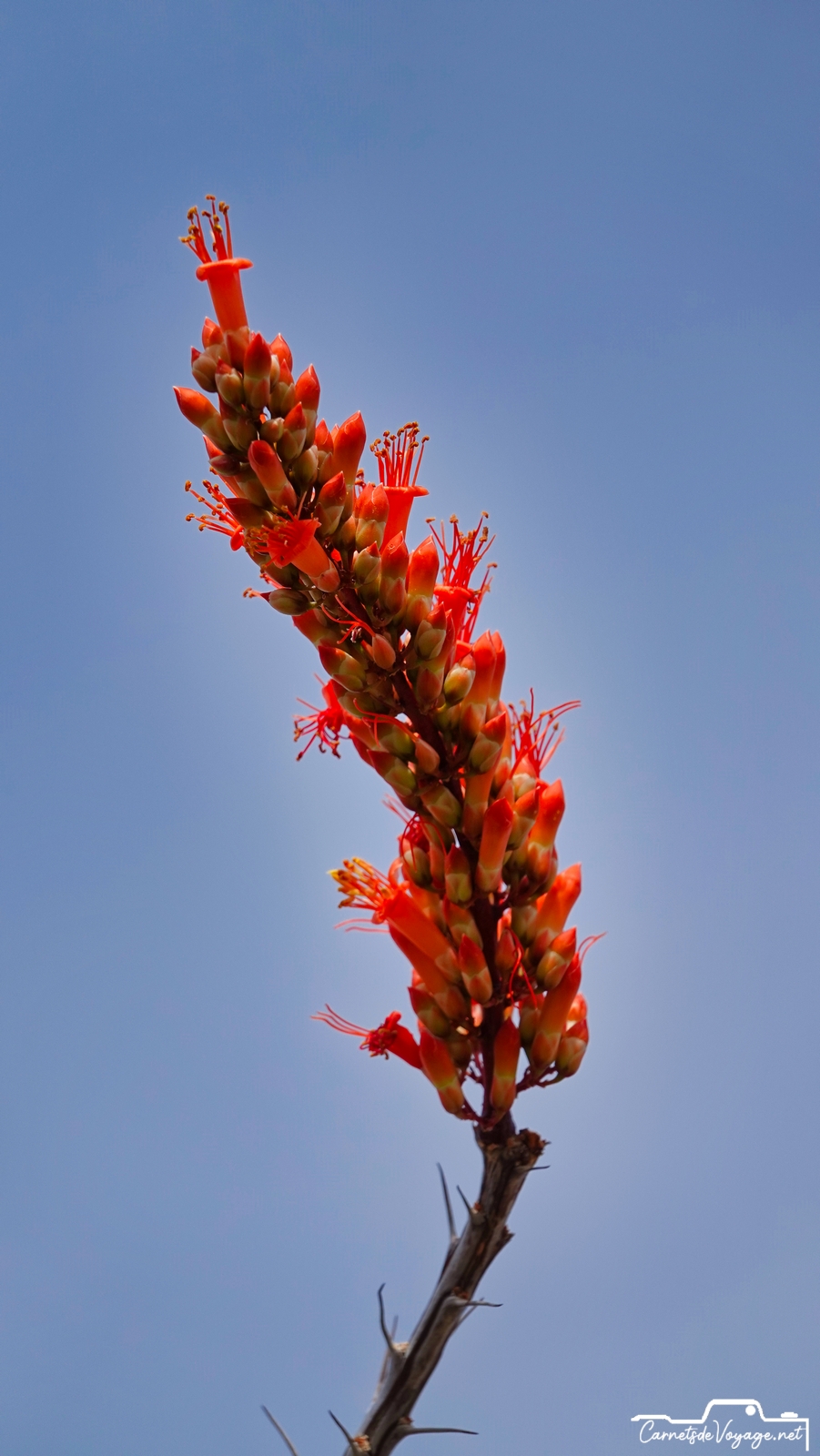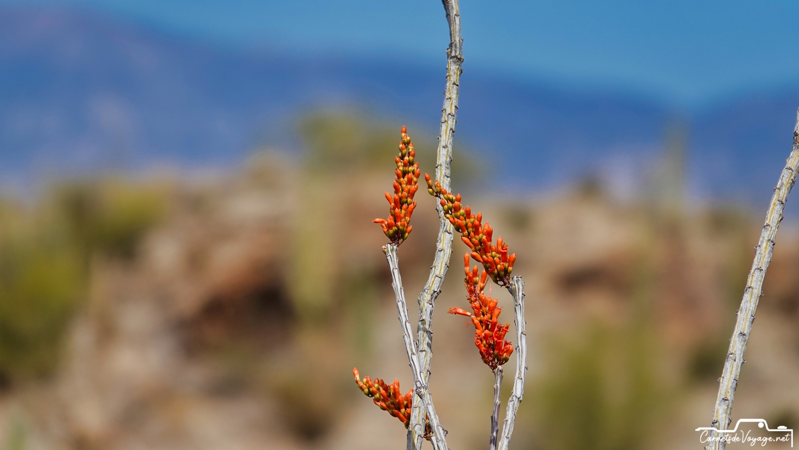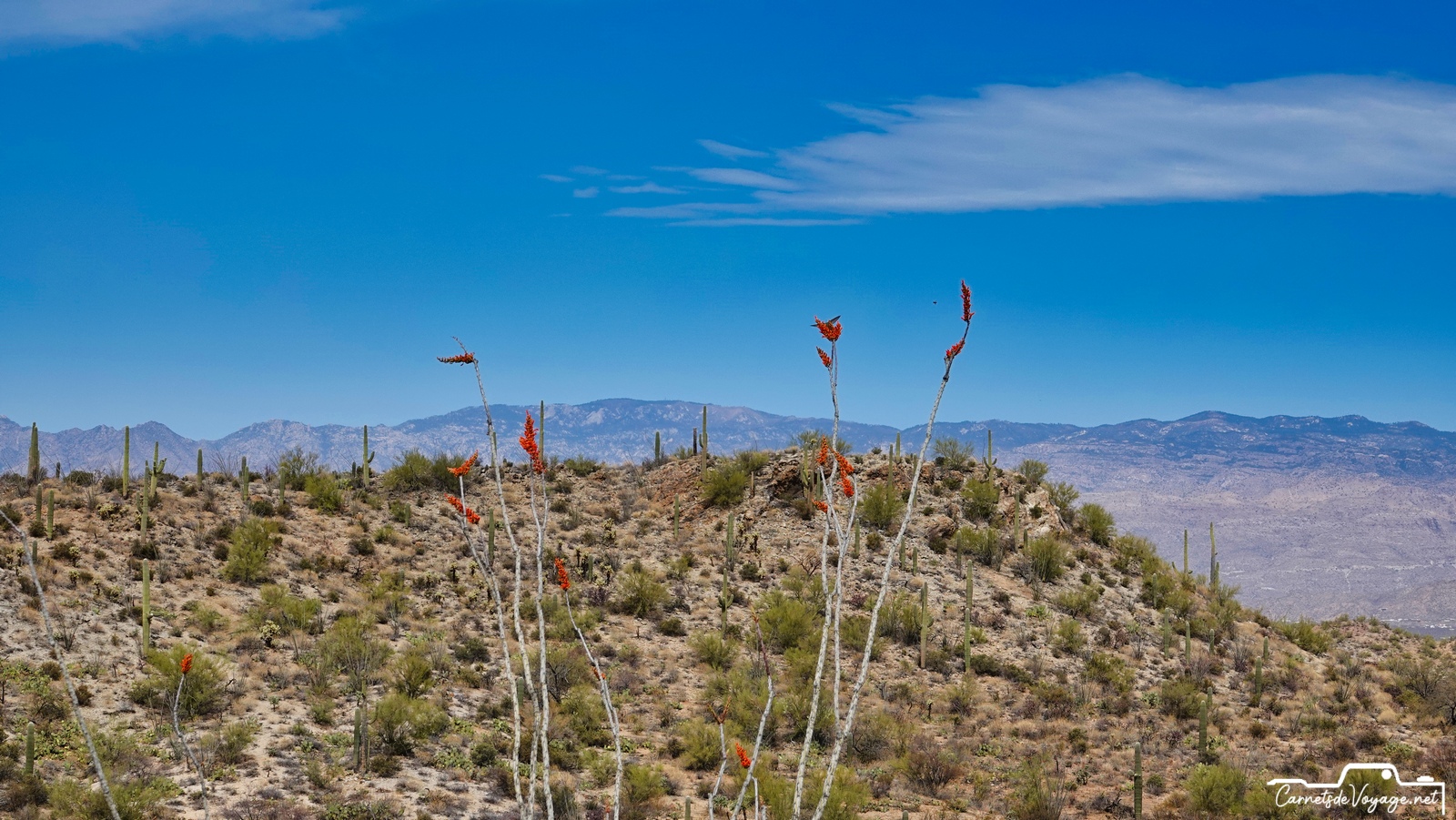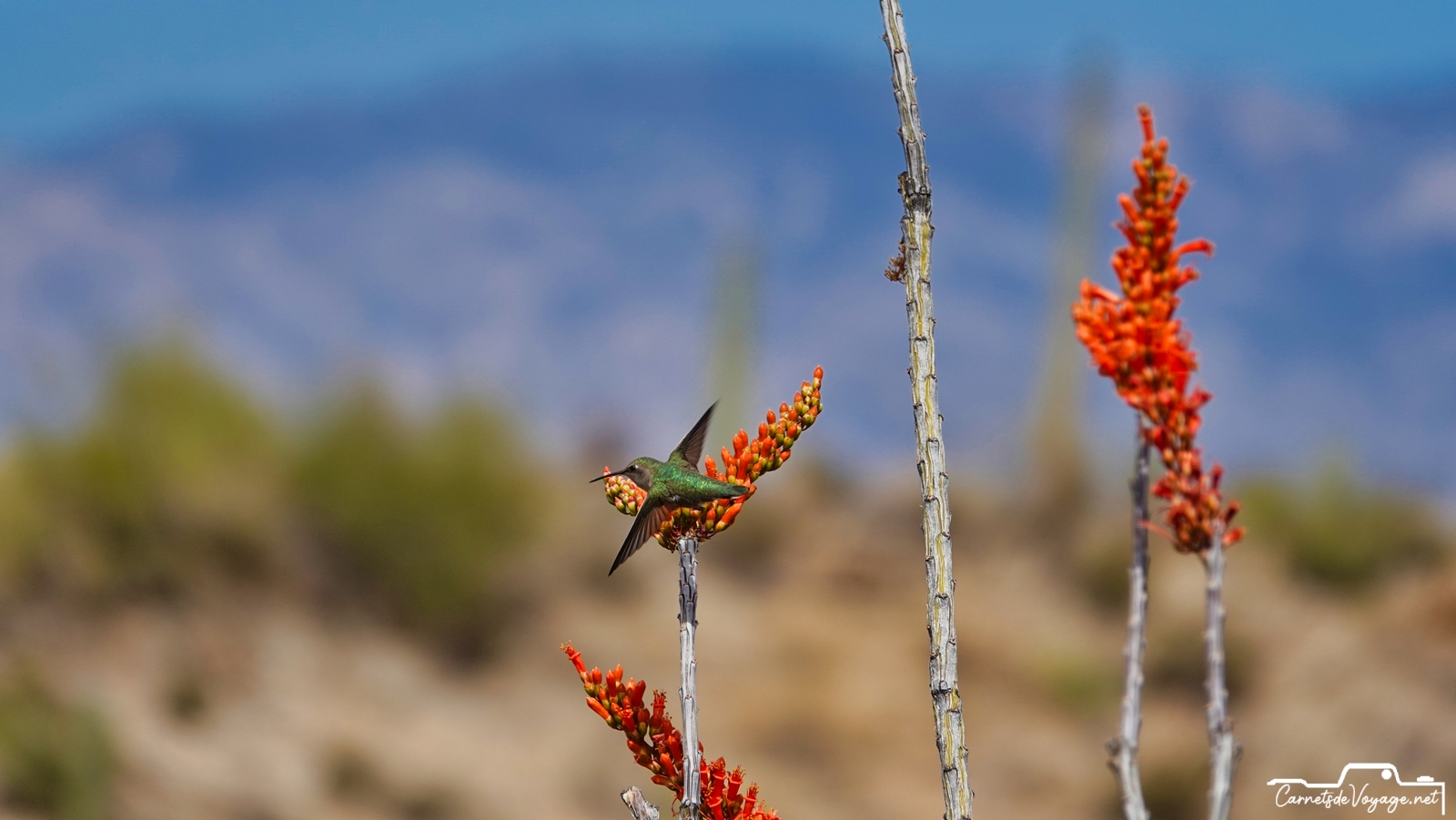 Un joli colibri est venu butiner les rares fleurs des ocotillos, ces longues plantes très piquantes, qui ont l’air d’un tas de branches mortes, sauf pendant la saison des pluies, l’été, où elles se parent de vert. en ce moment, c’est leur période de floraison. toujours impressionnant de voir ces minuscules oiseaux voler si vite et changer de sens si rapidement !